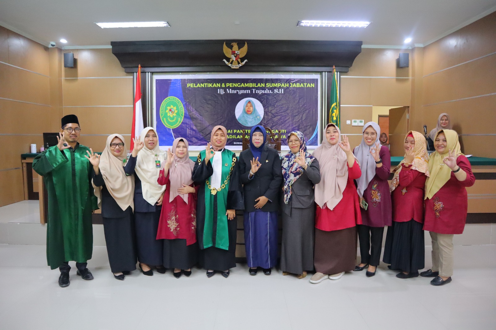 Suwawa 19 Oktober 2023, bertempat di ruang sidang utama Pengadilan Agama Suwawa, dilaksanakan Pelantikan Dan Pengambilan Sumpah Jabatan Panitera Pengganti Pengadilan Agama Suwawa, Ibu Hj. Maryam Tapulu., S.H. Pelantikan Dan Pengambilan Sumpah Jabatan Panitera Pengganti Pengadilan Agama Suwawa hari ini dihadiri oleh Ketua Pengadilan Tinggi Agama Gorontalo beserta jajarannya, karena pegawai yang dilantik hari ini sebelumnya beliau merupakan pegawai yang berasal dari Pengadilan Tinggi Agama Gorontalo.