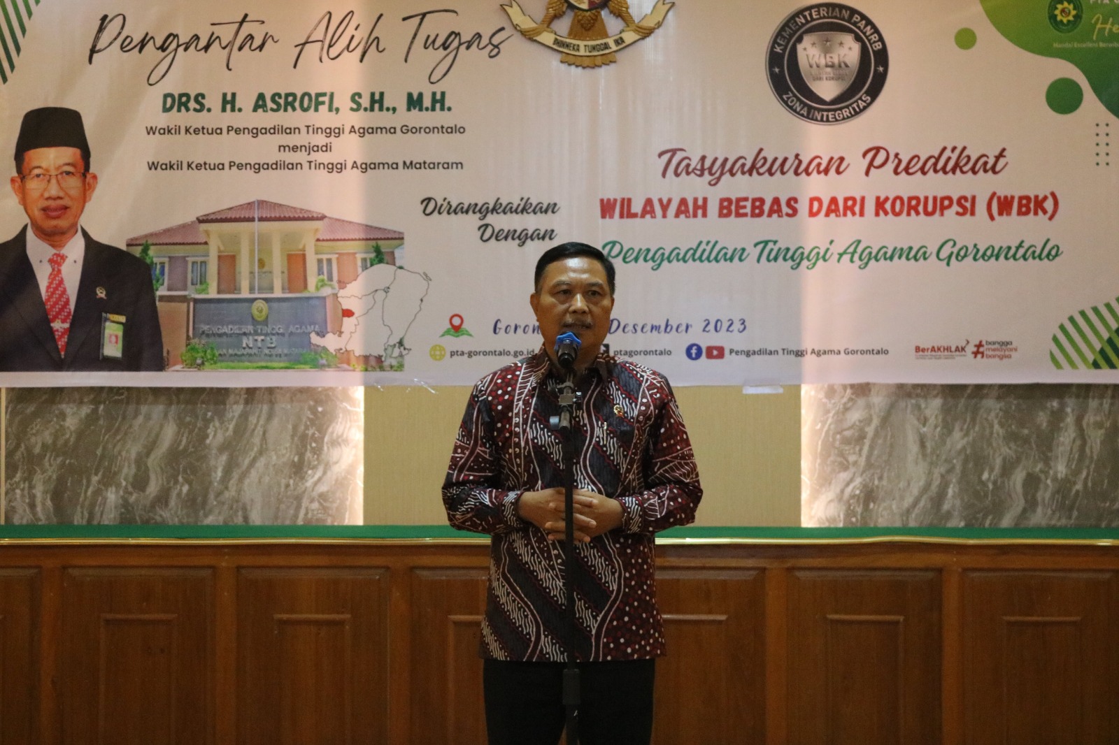 Adapun acara pengantar alih tugas tersebut dibuka oleh YM. Hakim Tinggi Drs. Mhd. Nuh, S.H., M.H. dan YM. Hakim Tinggi Drs.H. Muhamad Camuda, M.H., sebagai perwakilan dari satuan kerja yang ditinggalkan, dan kemudian dilanjutkan oleh YM Bapak Drs. H. Asrofi, S.H., M.H., yang menyampaikan pesan dan kesannya selama berada di PTA Gorontalo dan dilanjutkan sambutan dan syukuran WBK Oleh YM. Bapak Ketua Pengadilan Tinggi Agama Gorontalo, Drs. H. Abdullah, S.H, M.H. Syukuran ini berdasarkan Surat Keputusan Sekretaris Mahkamah Agung RI No. 1351/SEK/SK.PW1.1.1/XII/2023 yang menetapkan bahwa satuan kerja Pengadilan Tinggi Agama Gorontalo berhasil meraih predikat Wilayah Bebas dari Korupsi (WBK). Dalam ucap dan syukurnya, YM. KPTA Gorontalo berharap agar seluruh satuan kerja di wilayah PTA Gorontalo bisa menyusul untuk meraih predikat WBK.