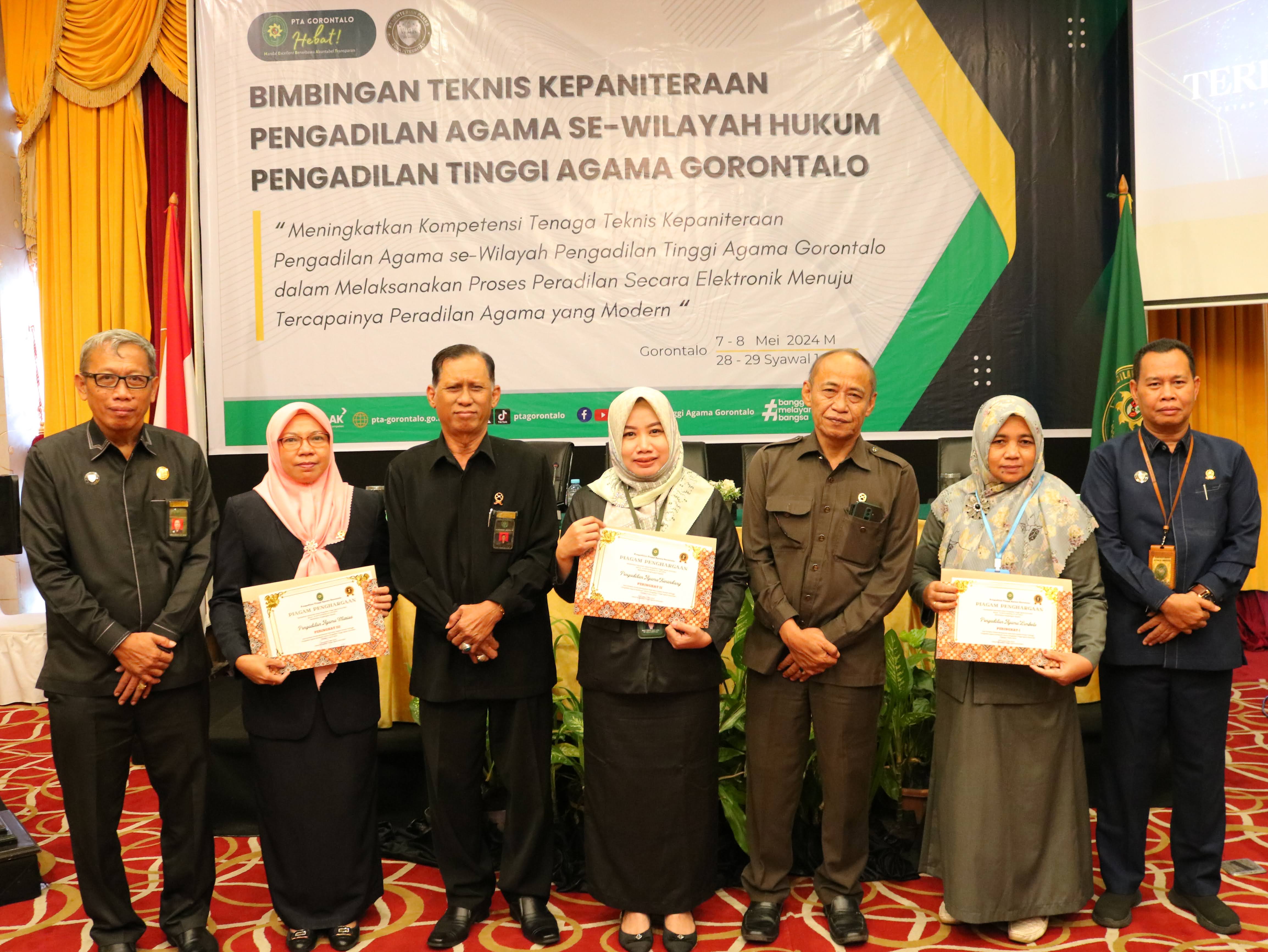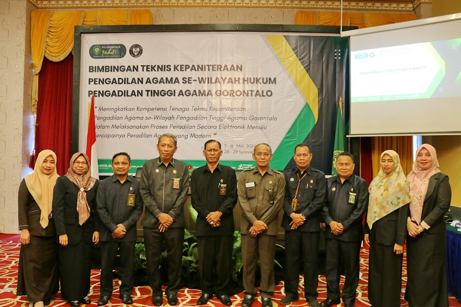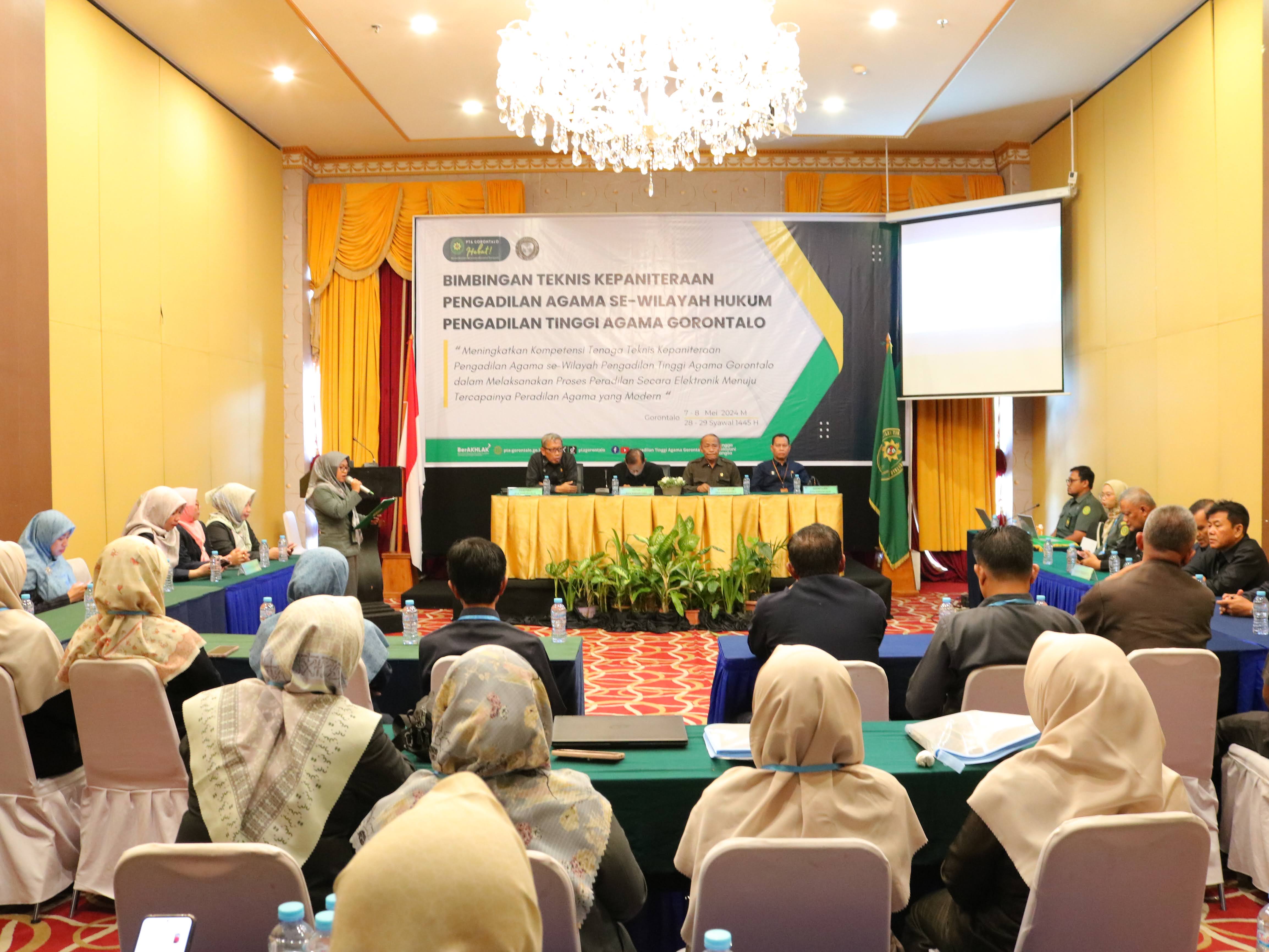 Gorontalo, PTA Gorontalo menggelar Bimbingan Teknis Kepaniteraan Pengadilan Agama se-Wilayah Hukum PTA Gorontalo di Hotel Grand Q Kota Gorontalo yang mengusung tema “Meningkatkan Kompetensi Tenaga Teknis Kepaniteraan Pengadilan Agama se-Wilayah PTA Gorontalo dalam Melaksanakan Proses Peradilan Secara Elektronik Menuju Tercapainya Peradilan Agama yang Modern” . Kegiatan ini berlangsung selama 2 hari, dimulai dari tanggal 7-8 Mei 2024 dan diikuti oleh 36 peserta yang berasal dari Pengadilan Tinggi Agama Gorontalo dan Pengadilan Agama se-wilayah Gorontalo. Selain dihadiri oleh para peserta bimtek, acara pembukaan ini juga dihadiri oleh Ketua, Wakil Ketua, Hakim Tinggi, Sekretaris dan Panitera PTA Gorontalo.