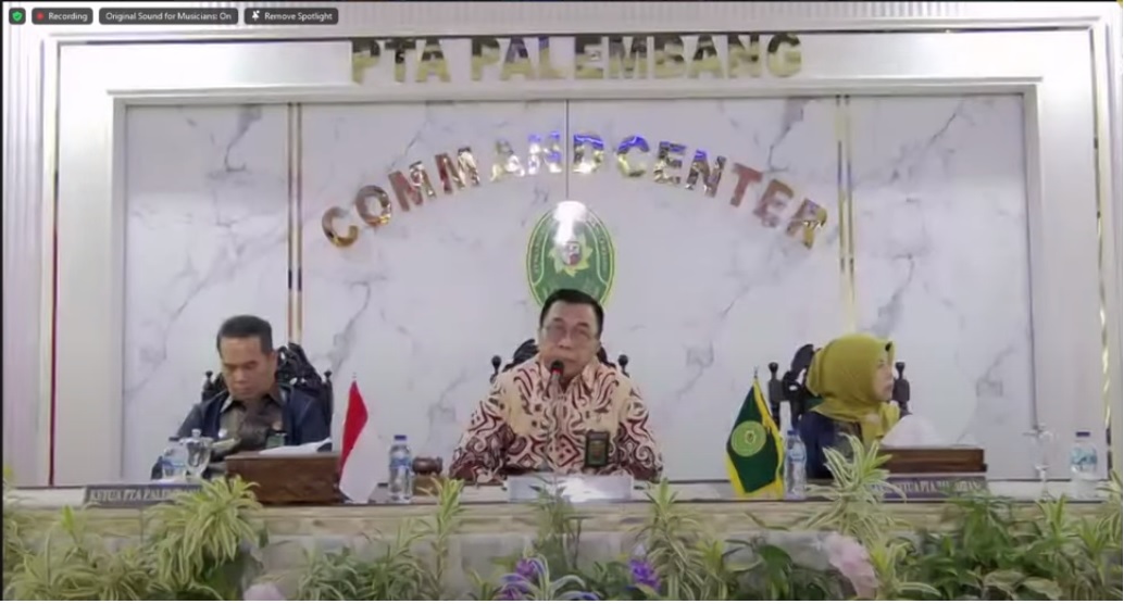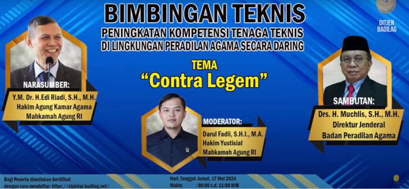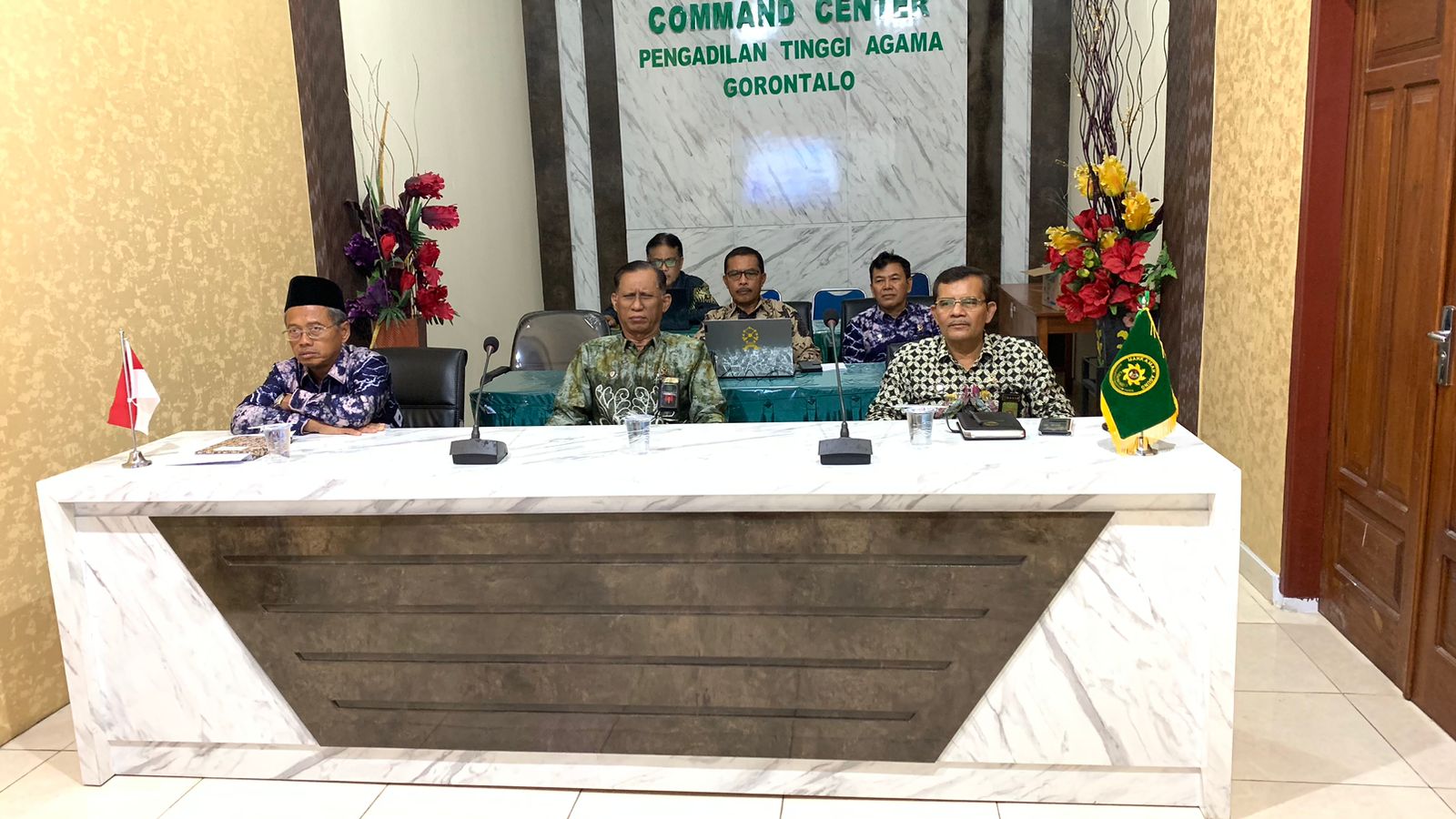 Gorontalo - Jum’at (17/05) Bertempat di Command Center Pengadilan Tinggi Agama Gorontalo, Ketua Dr. H. Chazim Maksalina, M.H., dan Para Hakim Tinggi Pengadilan Tinggi Agama Gorontalo mengikuti kegiatan Bimbingan Teknis Peningkatan Kompetensi Tenaga Teknis di Lingkungan Peradilan Agama secara daring dengan tema “Contra Legem” berdasarkan surat Direktur Jenderal Badan Peradilan Agama nomor 931/DJA/DL1.10/V/2024. Kegiatan diawali dengan menyanyikan lagu Indonesia Raya dan Hymne Mahkamah Agung, dilanjutkan dengan pembacaan ayat suci Al-Qur’an dan pembacaan doa.
