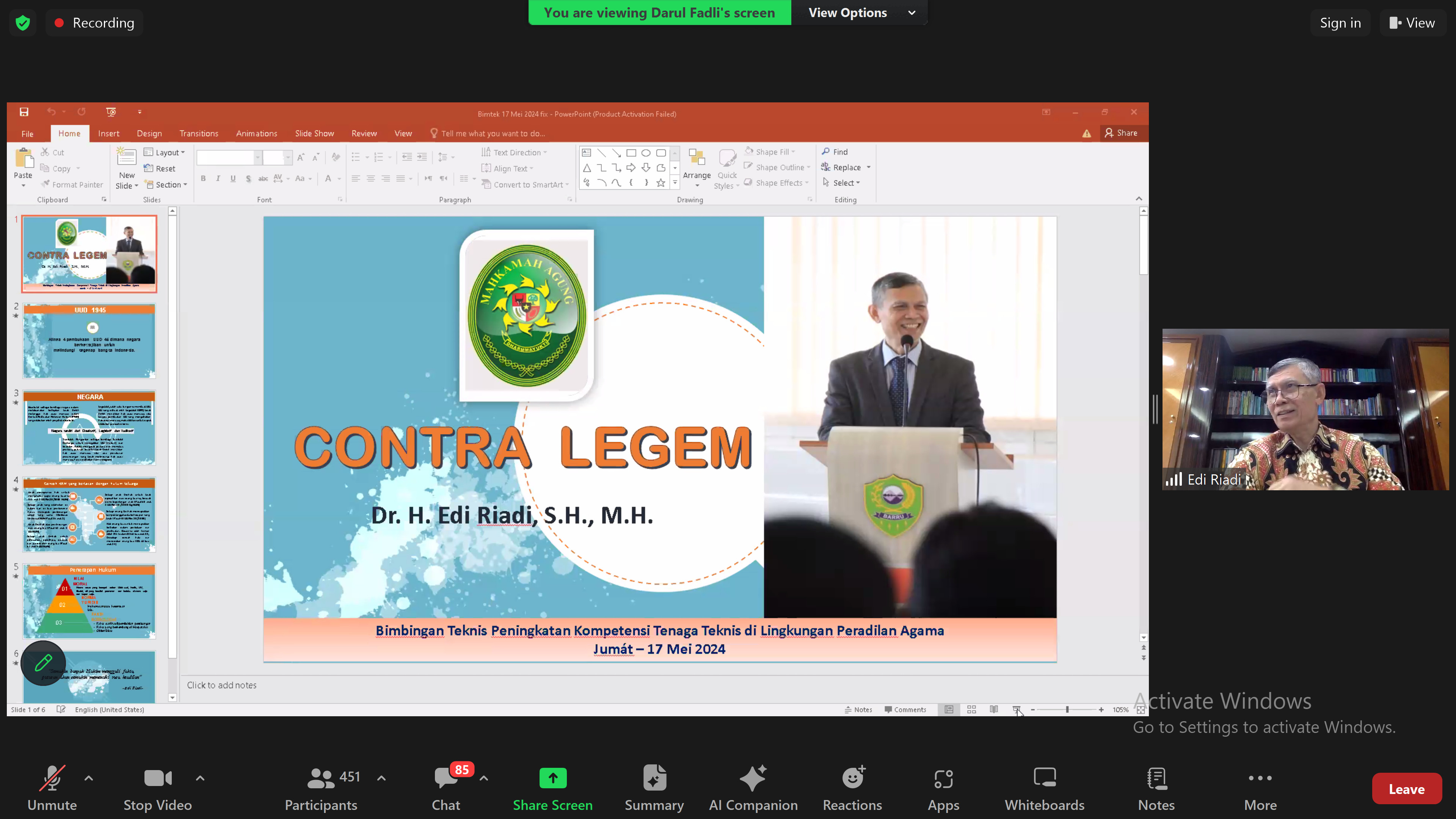 Narasumber pada kegiatan ini Yang Mulia Hakim Agung Kamar Agama MA-RI Bapak Dr. H.Edi Riadi, S.H., M.H. Ruang lingkup materi yang dibahas yaitu penerapan asas contra legem, beliau memaparkan materi terkait asas contra legem menurut beliau asas ini sangat penting dipelajari dan dipahami utamanya kepada Hakim karena Hakim merupakan seorang penegak hukum.