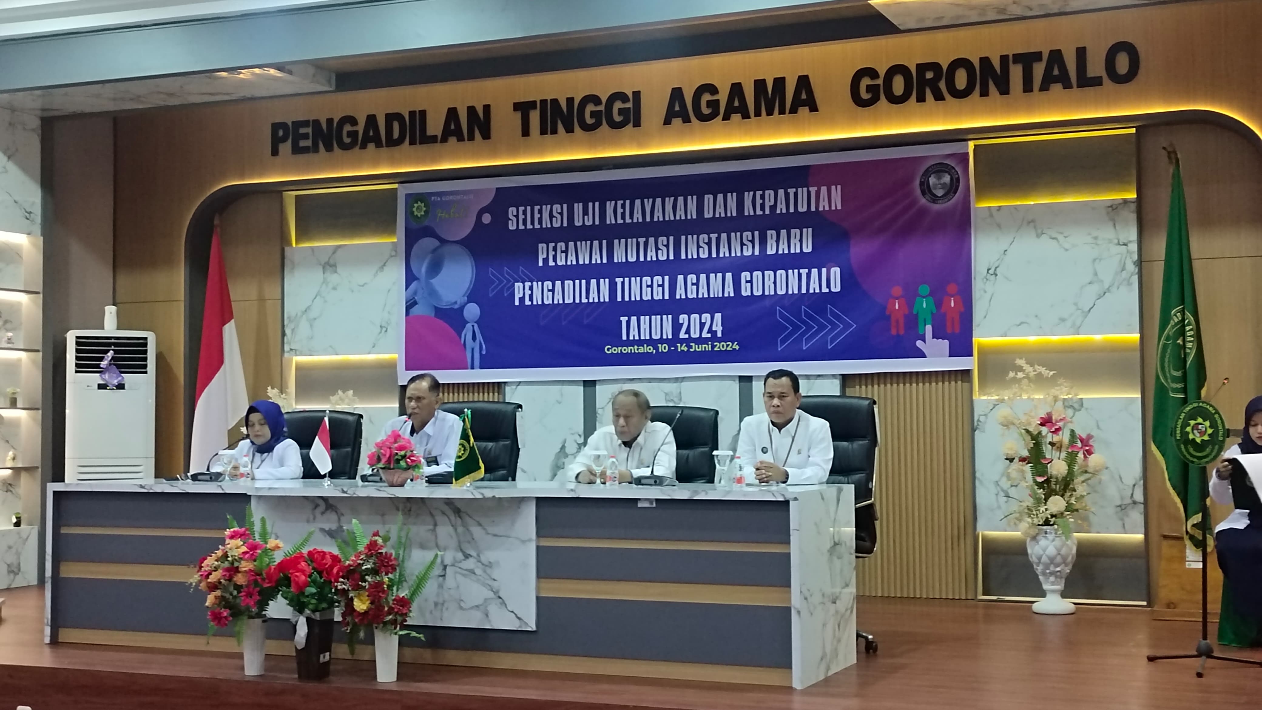 Gorontalo, 10 Juni 2024 - Seleksi Pegawai Mutasi Instansi Baru di lingkungan Pengadilan Tinggi Agama (PTA) Gorontalo resmi dibuka pada Senin, pukul 08.30 WITA. Acara pembukaan yang berlangsung di aula pertemuan PTA Gorontalo ini dipimpin oleh Ketua PTA Gorontalo, Dr. H. Chazim Maksalina, M.H. beserta wakil, sekretaris dan ketua panitia. Kegiatan ini dihadiri oleh seluruh pejabat PTA Gorontalo, panitia seleksi, dan para peserta ujian seleksi sebanyak 21 orang.