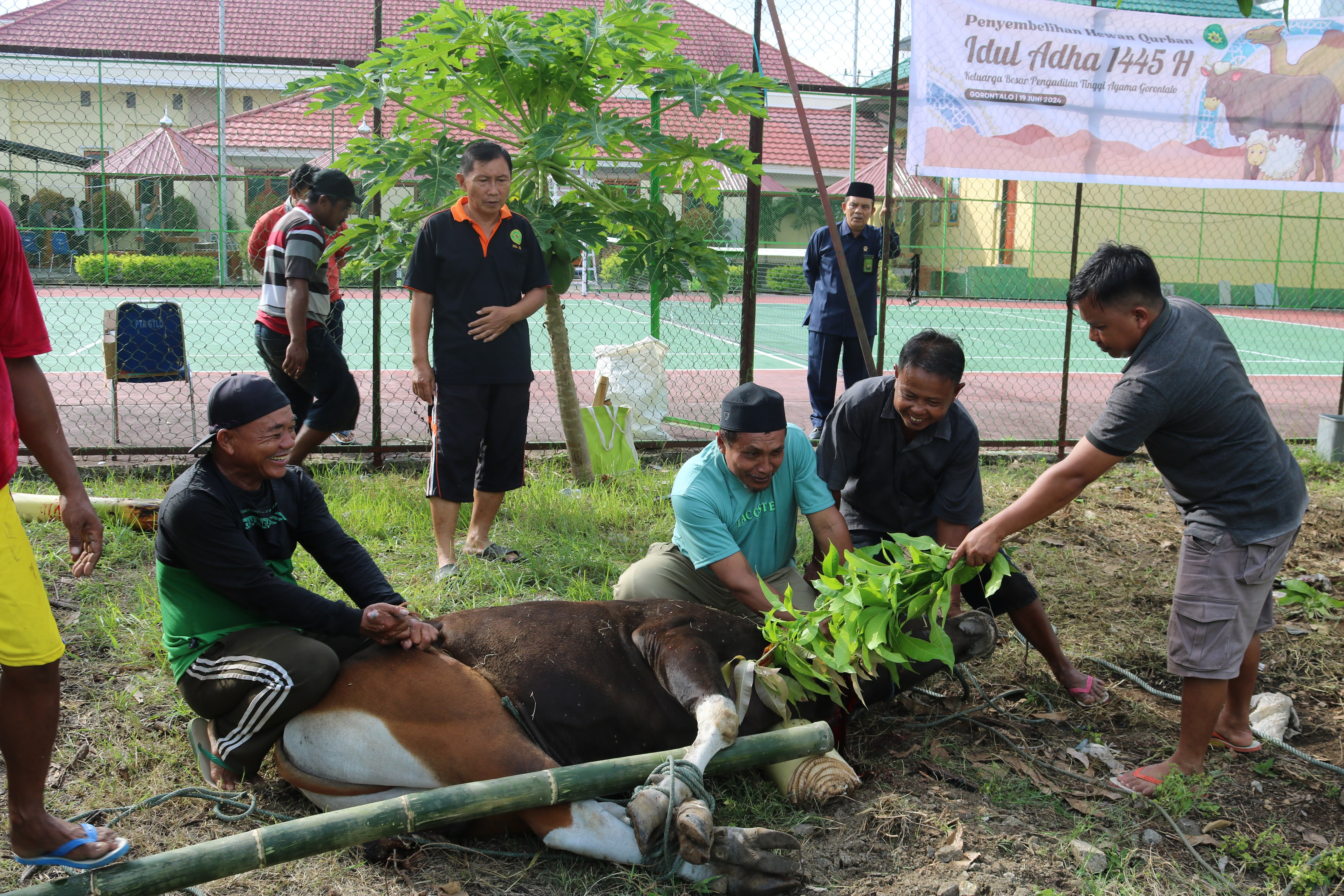 Prosesi penyembelihan hewan qurban dilaksanakan dengan khidmat. Tahun ini, Pengadilan Tinggi Agama Gorontalo berhasil mengumpulkan sumbangan untuk menyembelih lima ekor sapi. Empat ekor diantara sumbangan hewan Qurban dari para pegawai pengadilan, dan satu ekor merupakan sumbangan langsung dari Bank Syariah Indonesia. Hewan-hewan qurban ini telah diperiksa kesehatannya dan dinyatakan layak untuk disembelih sesuai dengan syariat Islam.
