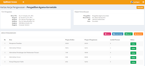 Pada pengawasan daerah ini, pertama kalinya diimplementasikannya aplikasi Awass yang merupakan salah satu inovasi PTA Gorontalo dalam melaksanakan fungsi pengawasan kepada Pengadilan Agama sebagaimana diamanatkan dalam Undang-Undang Nomor 7 Tahun 1989 Tentang Peradilan Agama, sebagaimana telah diubah dengan Undang-Undang Nomor 3 Tahun 2006 dan perubahan kedua dengan Undang-Undang Nomor 50 Tahun 2009. Pada aplikasi tersebut Tim Pengawas menuangkan temuan yang terdiri dari Kondisi, Kriteria, Sebab, Akibat, dan Rekomendasi dan kemudian dicetak dalam format lembar temuan untuk kemudian diserahkan pada Ketua Pengadilan Agama pada saat ekspose hasil pengawasan.