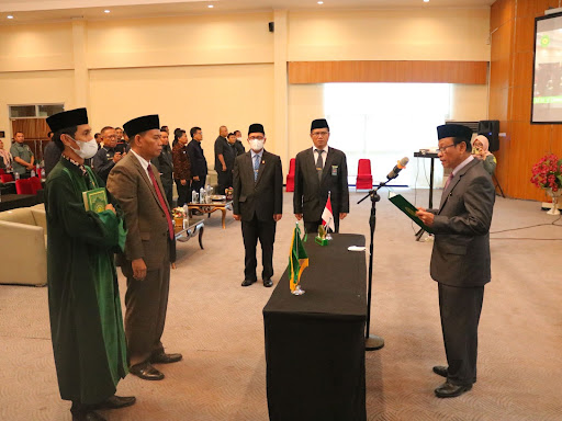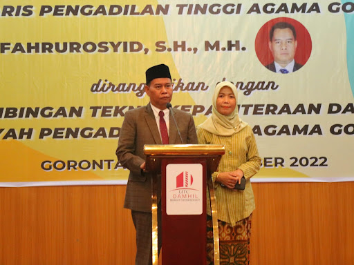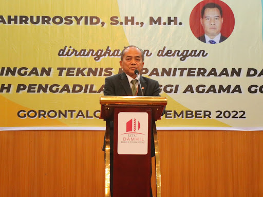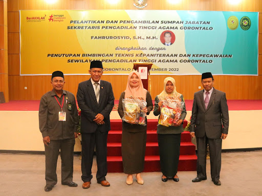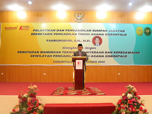 Gorontalo - Ketua Pengadilan Tinggi Agama Gorontalo Dr. Drs. H. Muh. Abduh Sulaeman, S.H., M.H melantik dan mengambil sumpah jabatan Sekretaris Pengadilan Tinggi Agama Gorontalo Fahrurosyid, S.H., M.H. sekaligus menutup kegiatan Bimbingan Teknis Kepaniteraan dan Bimbingan Kepegawaian sewilayah Pengadilan Tinggi Agama Gorontalo pada hari Rabu (30 November 2022) di UTC Damhil, Kota Gorontalo. Fahrurosyid sebelumnya menjabat sebagai Kepala Bagian Perencanaan dan Kepegawaian Pengadilan Tinggi Agama Mataram.