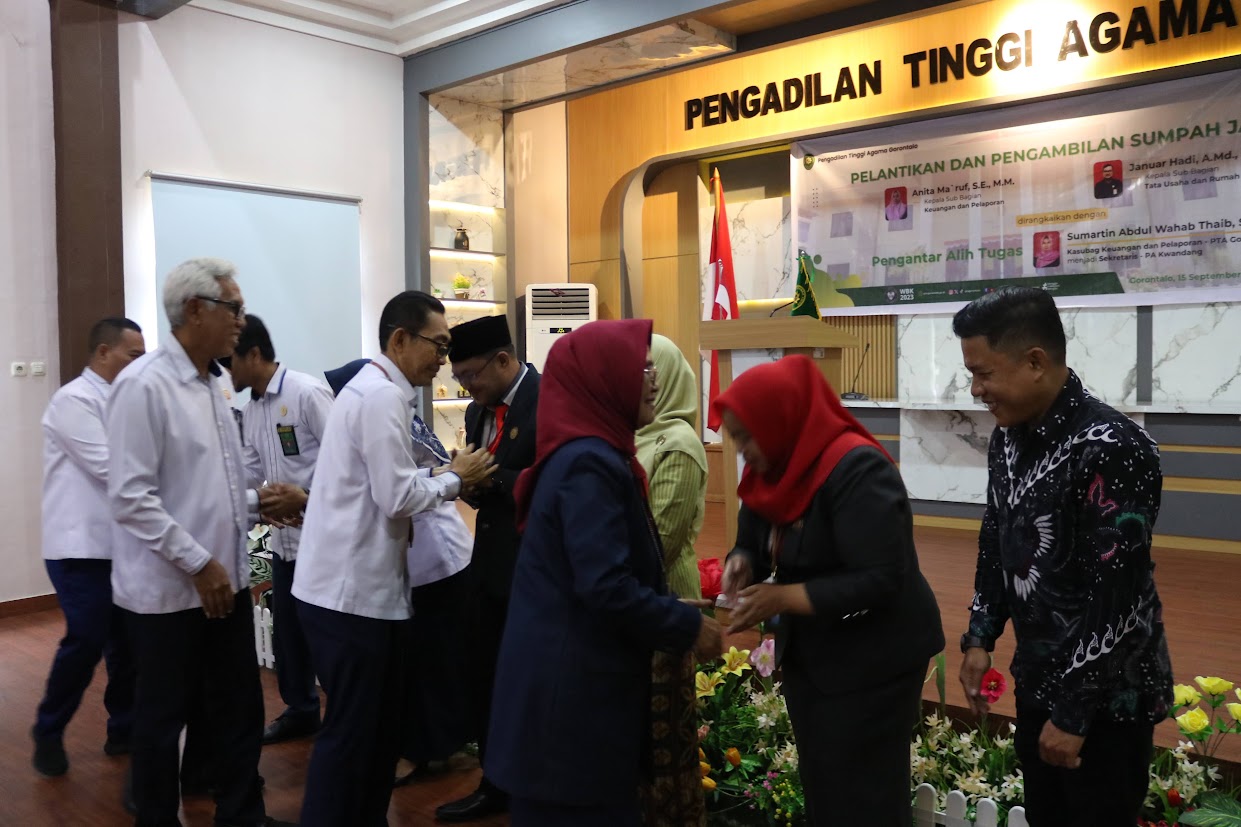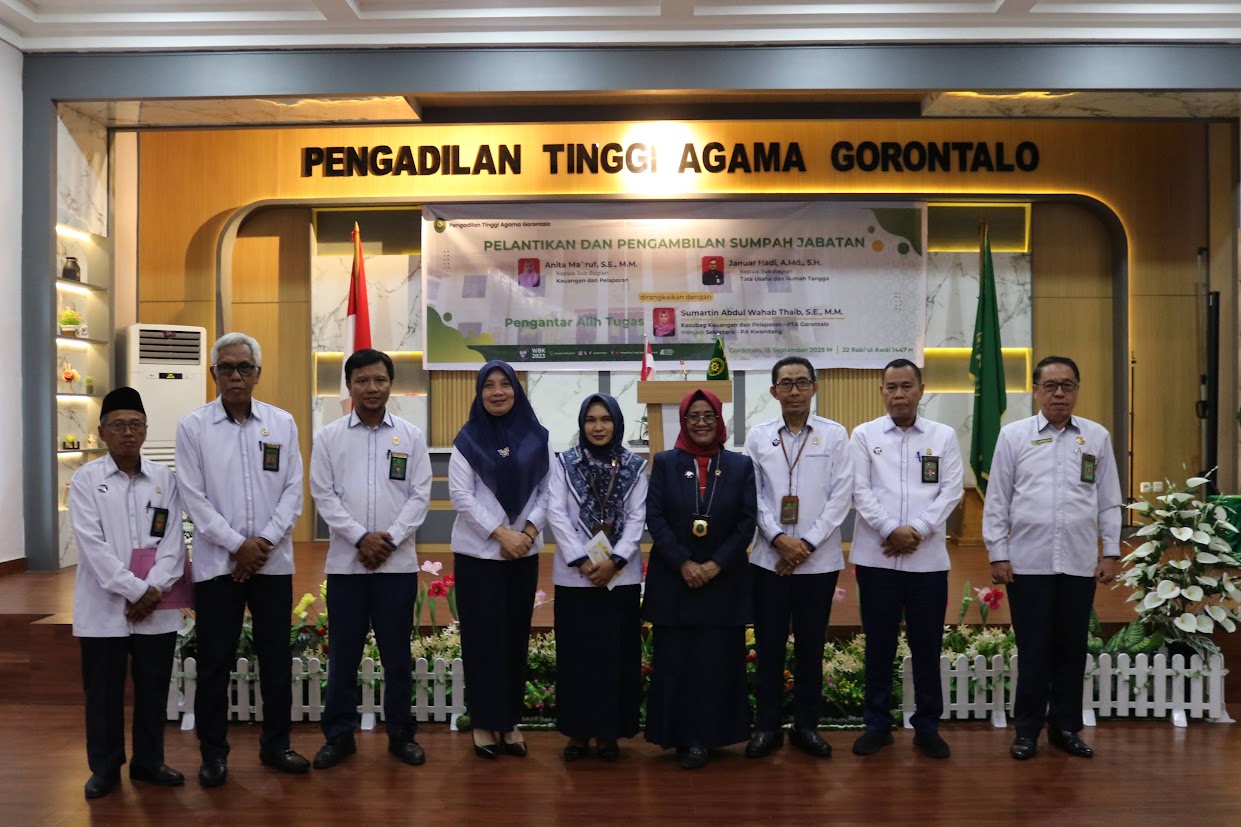 Dalam kesempatan tersebut, Sdri. Anita Ma’ruf, S.E., M.M. resmi dilantik sebagai Kepala Subbagian Keuangan dan Pelaporan PTA Gorontalo, sementara Sdr. Januar Hadi, A.Md., S.H. dipercaya menjabat Kepala Subbagian Tata Usaha dan Rumah Tangga PTA Gorontalo. Rangkaian acara turut diisi dengan Pengantar Alih Tugas Sdri. Sumartin Abdulwahab Thaib, S.E., M.M., yang kini mendapat amanah baru sebagai Sekretaris Pengadilan Agama Kwandang.