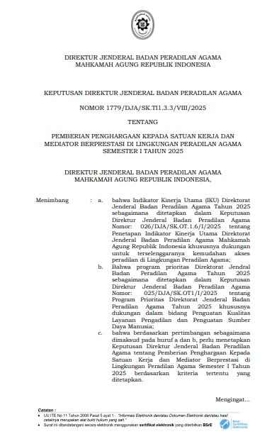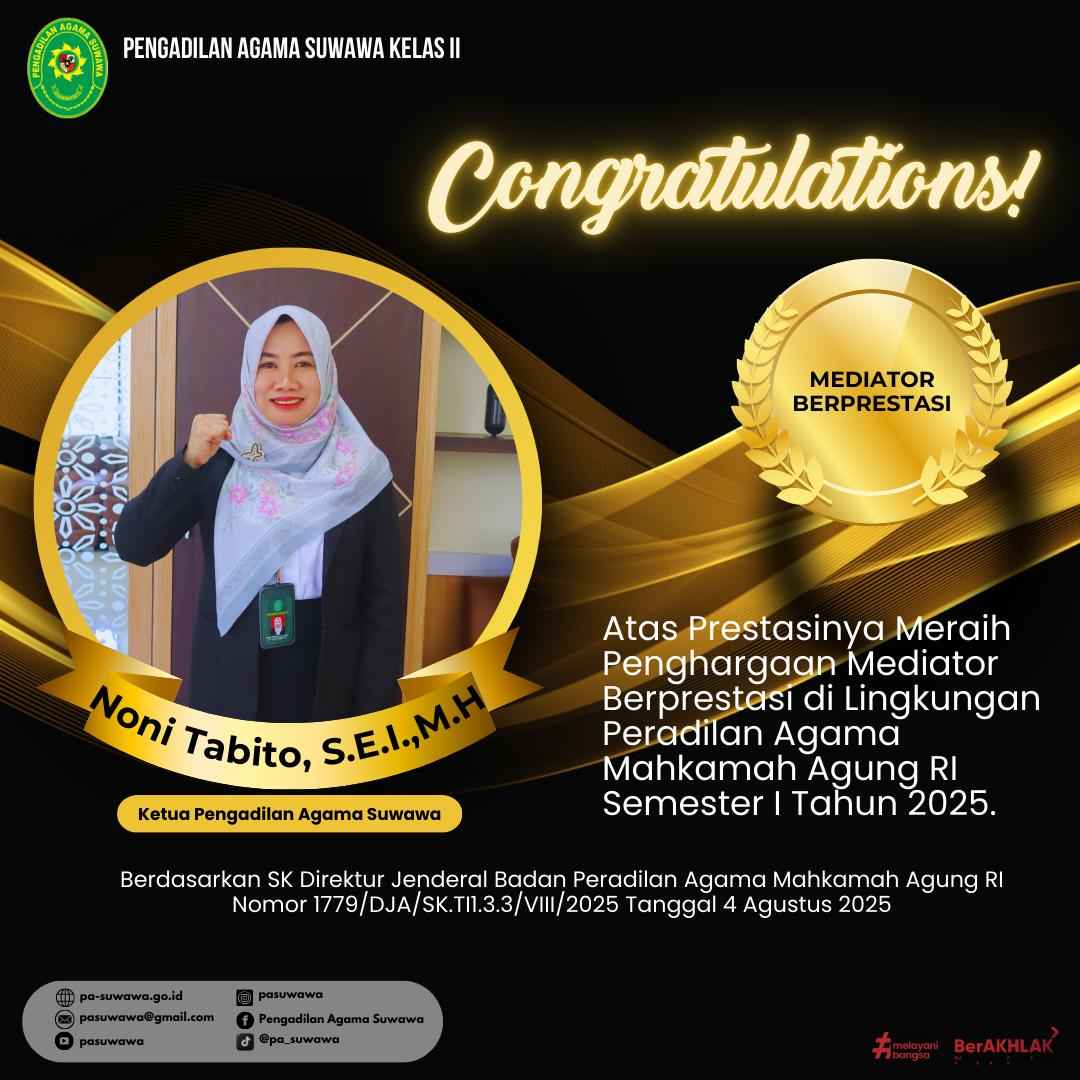 Suwawa - Kamis, 4 September 2025 berdasarkan Keputusan Direktur Jenderal Badan Peradilan Agama Nomor : 1779/DJA/SK.TI1.3.3/VIII/2025 Tentang Pemberian Penghargaan Kepada Satuan Kerja dan Mediator Berprestasi dilingkungan Peradilan Agama Semester I Tahun 2025. Ketua Pengadilan Agama Suwawa Noni Tabito, S.E.I., M.H berhasil meraih penghargaan sebagai Mediator Internal dengan tingkat keberhasilan mediasi lebih dari 40%. Dalam Tingkat Nasional dibawah lingkungan Dirjen Badilag. Ketua Pengadilan Agama Suwawa sangat bersyukur atas penghargaan yang diterima dan terus berkomitmen untuk tetap melakukan berbagai upaya sehingga dapat mencapai hasil yang sangat luar biasa.