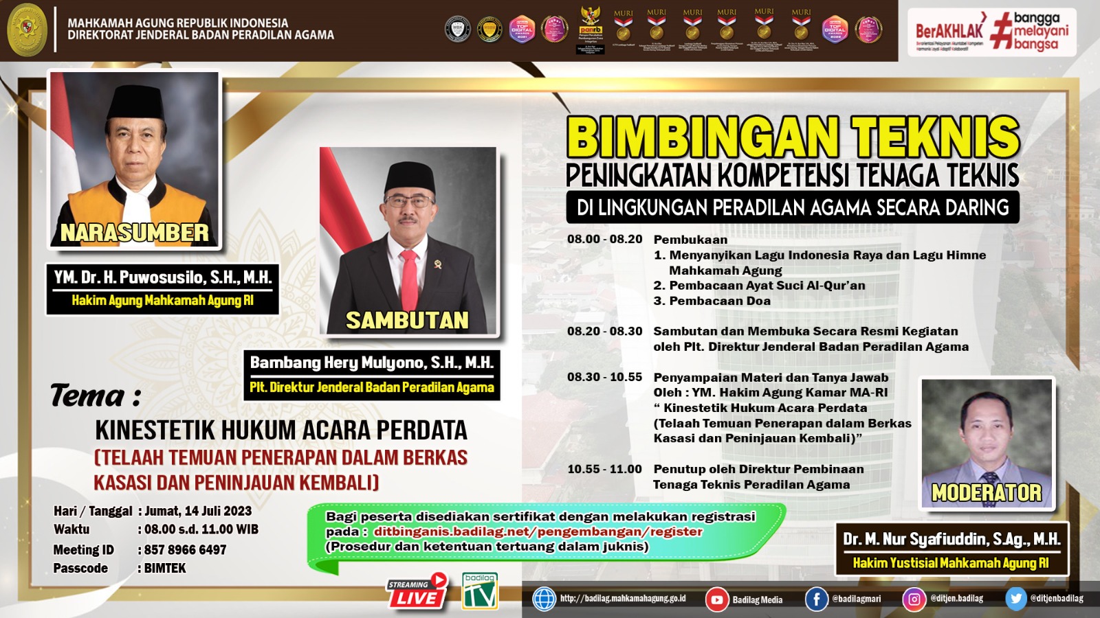 Kegiatan ini sebagai tindak lanjut dari Surat Direktorat Jenderal Badan Peradilan Agama Nomor 1927/DjA/PP.00/7/2023 tanggal 7 Juli 2023. Bimbingan teknis hari ini, dibawakan oleh narasumber Y.M. Dr. H. Purwosusilo, S.H., M.H. Hakim Agung Kamar Agama pada Mahkamah Agung Republik Indonesia.