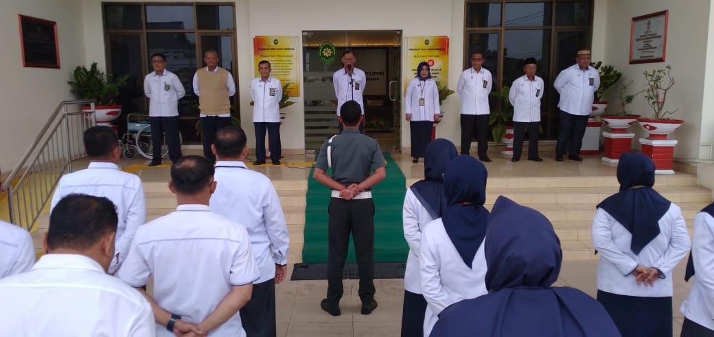 Gorontalo - Senin (12/2) Bertempat di halaman kantor Pengadilan Tinggi Agama Gorontalo, seluruh aparatur Pengadilan Tinggi Agama Gorontalo melaksanakan apel rutin pagi. Petugas apel pada senin pag ini adalah pemimpin apel Wahyu Saputra Kariem, MC Ayuk Candra Wardani A. Md, Pembaca do’a Chandra Hakinis, A. Md. Pembaca 8 Nilai Utama MARI dan ASN Berakhlak oleh Anita Ma'ruf, S.E. dan bertindak sebagai Pembina Apel kali ini yaitu Ketua Pengadilan Tinggi Agama Gorontalo, Dr. H. Chazim Maksalina, M.H.