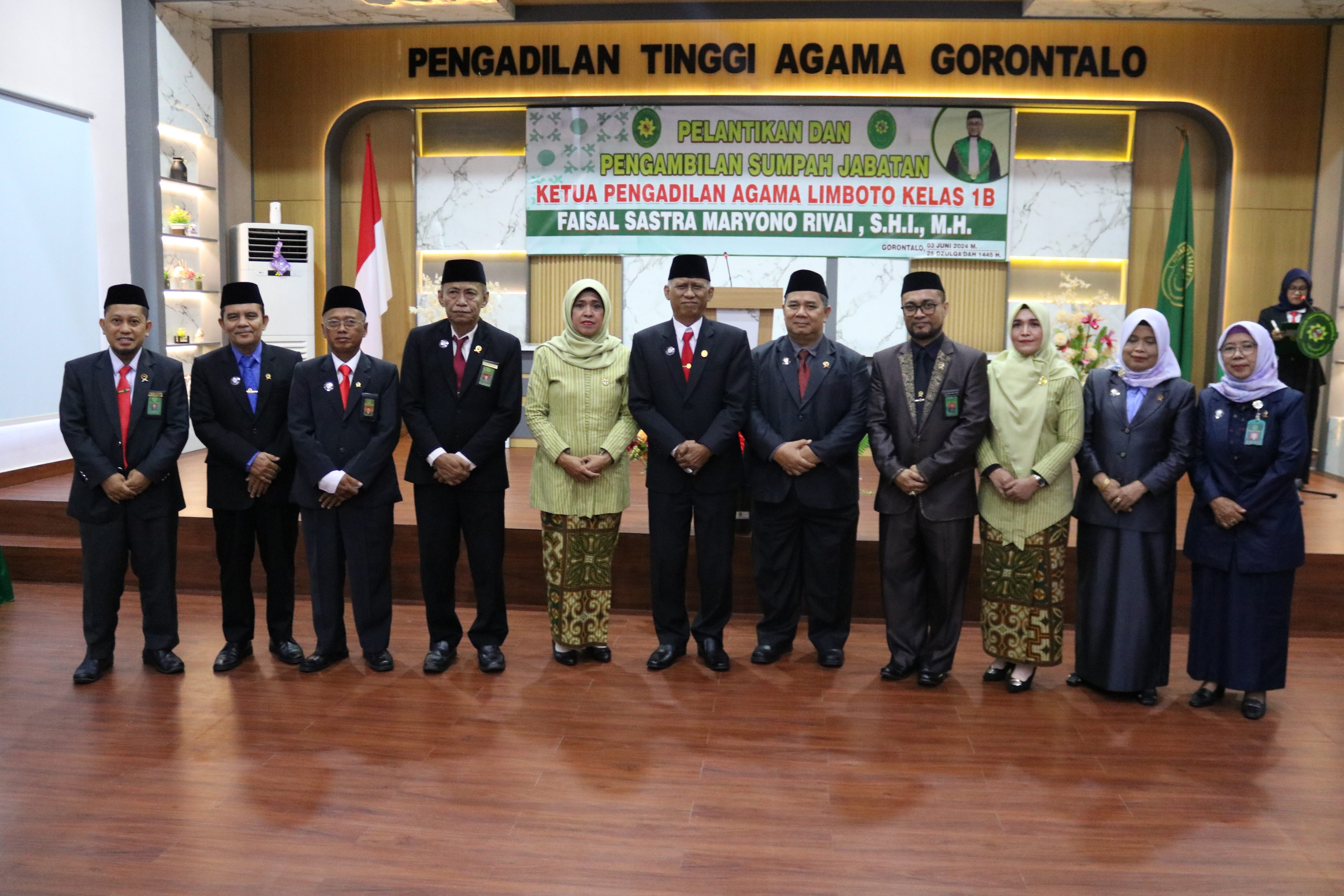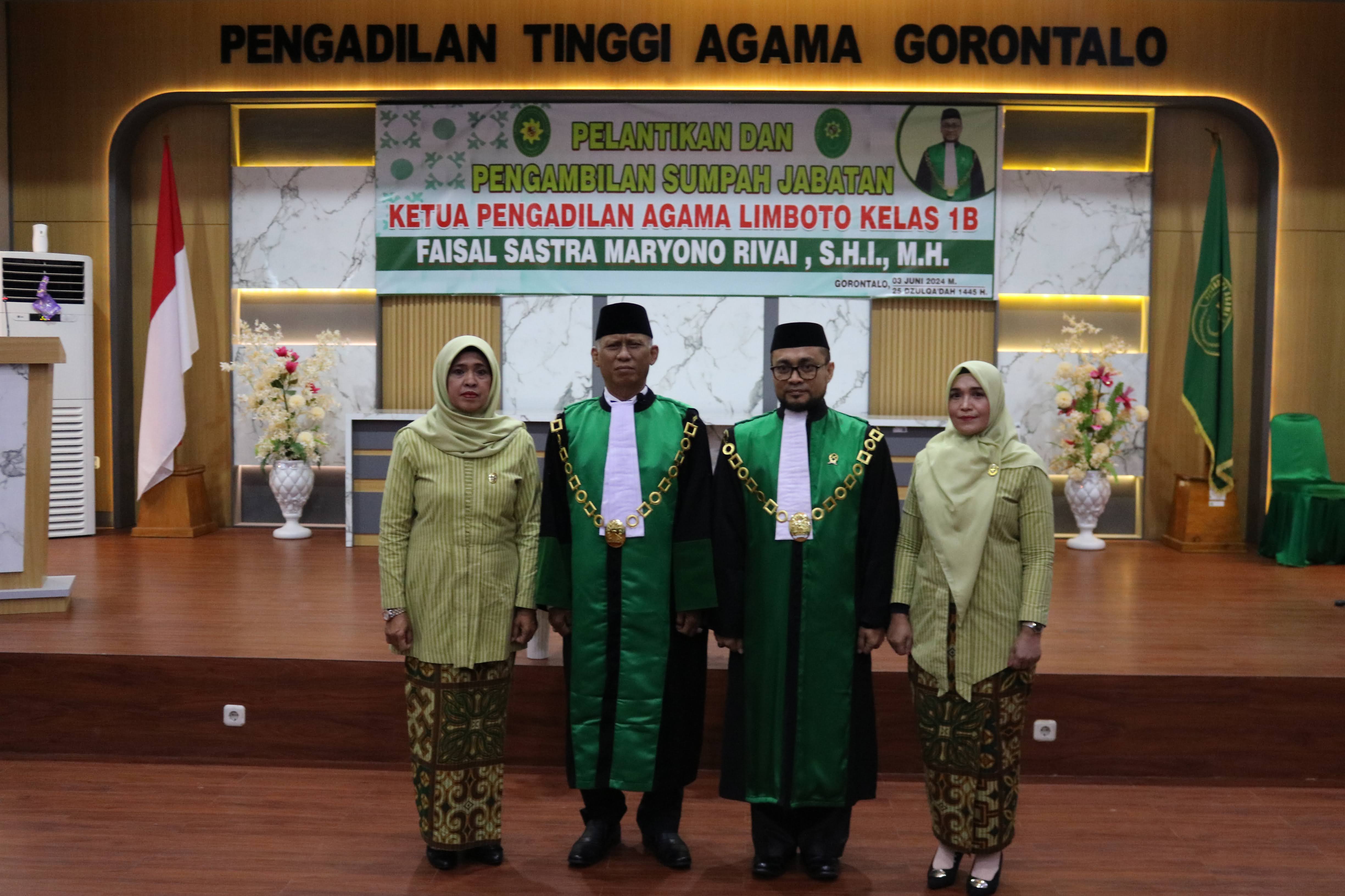 Gorontalo, 3 Juni 2024. Ketua Pengadilan Tinggi Agama Gorontalo Dr. H. Chazim Maksalina, M.H. melakukan pengambilan sumpah jabatan sekaligus melantik Ketua Pengadilan Agama Limboto, bertempat di Aula PTA Gorontalo acara yang juga dihadiri oleh Ketua, Wakil, Panitera & Sekretaris Pengadilan Agama sewilayah PTA Gorontalo, Dharmayukti karini dan juga para tamu undangan yang berasal dari PTA Palu dan PA Donggala, acara yang berlangsung pada pukul 10.00 WITA berlangsung secara lancar & khidmat.