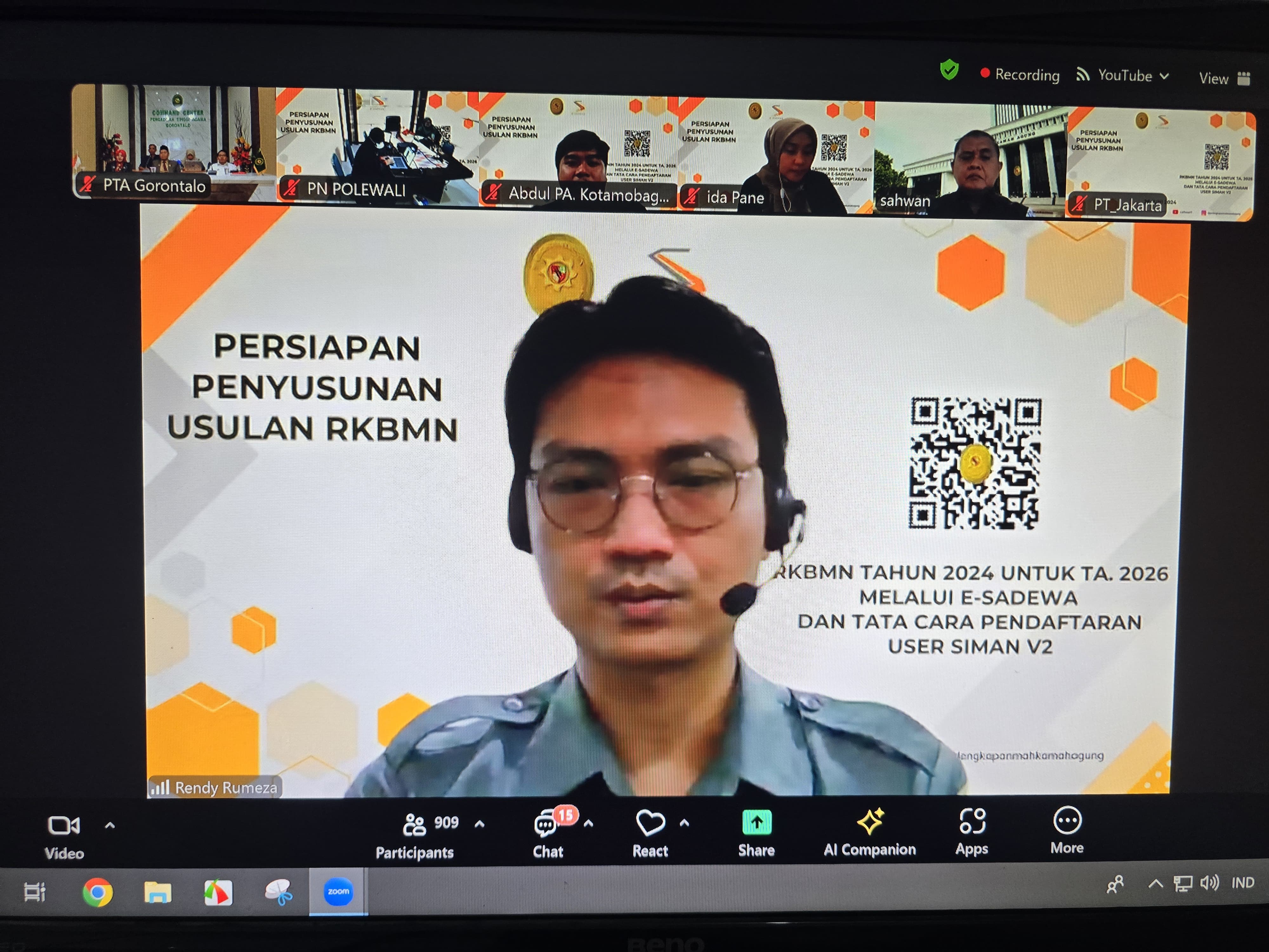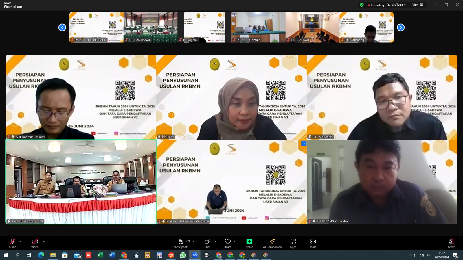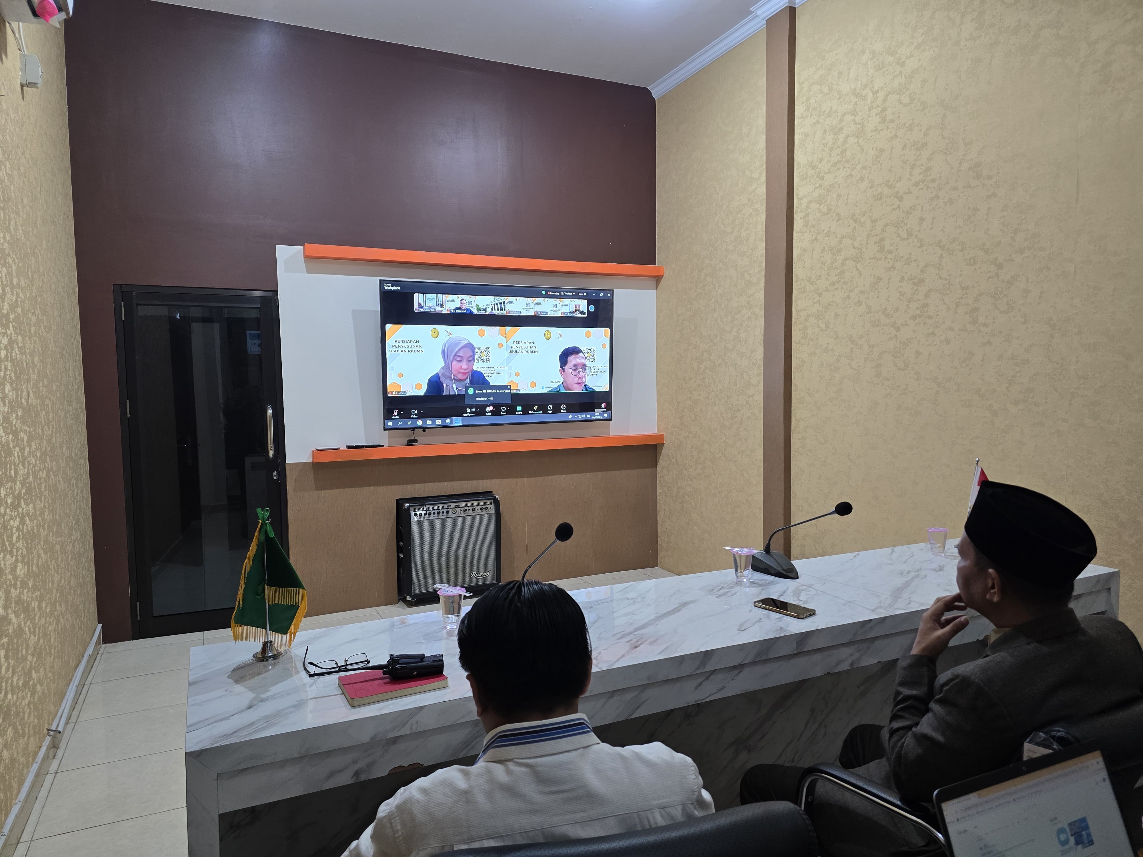 Gorontalo - Rabu, 26 Juni 2024 di ruang command center Pengadilan Tinggi Agama Gorontalo tepat pukul 10.00 WITA berlangsung kegiatan Persiapan Penyusunan Usulan RKBMN Tahun 2026 secara daring melalui aplikasi zoom meeting oleh Badan Urusan Administrasi Mahkamah Agung RI. Hadir dalam kegiatan tersebut Sekretaris PTA Gorontalo Fahrurrosyid, S.H., M.H, Kabag Umum dan Keuangan Rahmanto Bilondatu, S.H., M.M. dan Staf teknis aplikasi SIMAN.