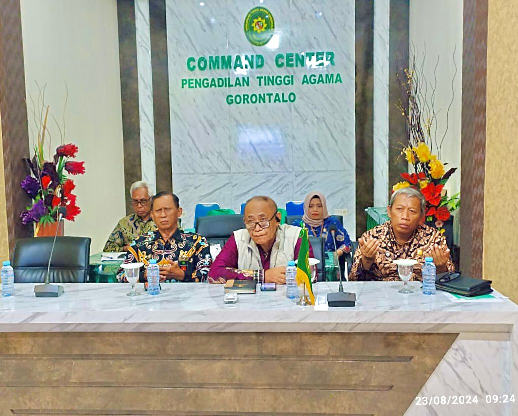 Gorontalo - Jumat, 23 Agustus 2024 pukul 09.00 WITA bertempat di Command Center PTA Gorontalo. Ketua, Wakil Ketua, Para Hakim Tinggi PTA Gorontalo mengikuti Bimbingan Teknis secara daring dengan tema Hukum Wakaf dalam Putusan Pengadilan. Kegiatan ini berdasarkan surat Direktur Jenderal Badan Peradilan Agama nomor 1799/DJA/DL1.10/VII/2024 tanggal 14 Agustus 2024. Kegiatan bimtek ini diawali dengan menyanyikan lagu Indonesia Raya dan Hymne Mahkamah Agung RI, dilanjutkan dengan pembacaan ayat suci Al-Qur’an dan pembacaan doa.