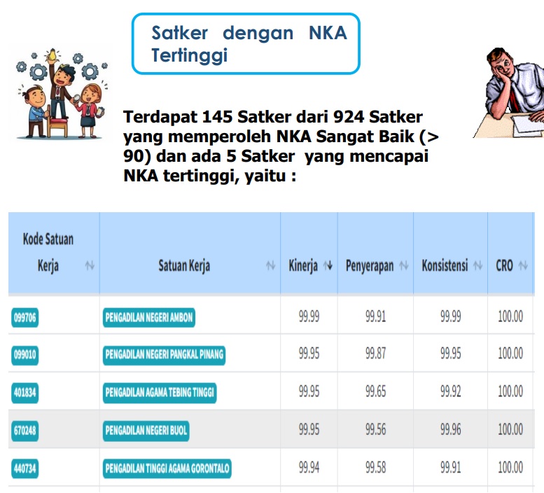 YOGYAKARTA (10/11/2024) - Nilai Kinerja Anggaran (NKA) Pengadilan Tinggi Agama Gorontalo mendapat apresiasi dari Direktorat Anggaran Bidang Polhukhankam dan BA BUN DJA Kementerian Keuangan sebagai peringkat tertinggi ke-5 di antara 924 satuan kerja di lingkup Badan Urusan Administrasi Mahkamah Agung Republik Indonesia dengan nilai mencapai 99,94 (SANGAT BAIK). Adapun Nilai Kinerja Anggaran (NKA) ini didapat dari nilai evaluasi kinerja anggaran dari aplikasi SMART memiliki bobot 60% dan nilai Indikator Kinerja Pelaksanaan Anggaran dari aplikasi OM-SPAN memiliki bobot 40%.