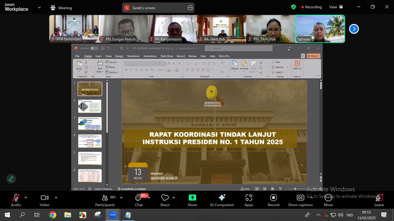 Gorontalo, 13 Februari 2025 – Badan Urusan Administrasi Mahkamah Agung menggelar rapat melalui video conference guna membahas tindak lanjut pelaksanaan Instruksi Presiden No. 1 Tahun 2025 tentang Efisiensi Belanja dalam Pelaksanaan APBN dan APBD TA 2025. Rapat ini dibuka dan dipimpin oleh Kepala Biro Perencanaan Mahkamah Agung RI, Sahwan, S.H., M.H. Rapat diikuti secara virtual oleh Sekretaris Pengadilan Tinggi Agama (PTA) Gorontalo, Fahrurosyid, S.H., M.H., serta Sekretaris Pengadilan Agama Gorontalo, Limboto, dan Suwawa di ruang Command Center PTA Gorontalo.