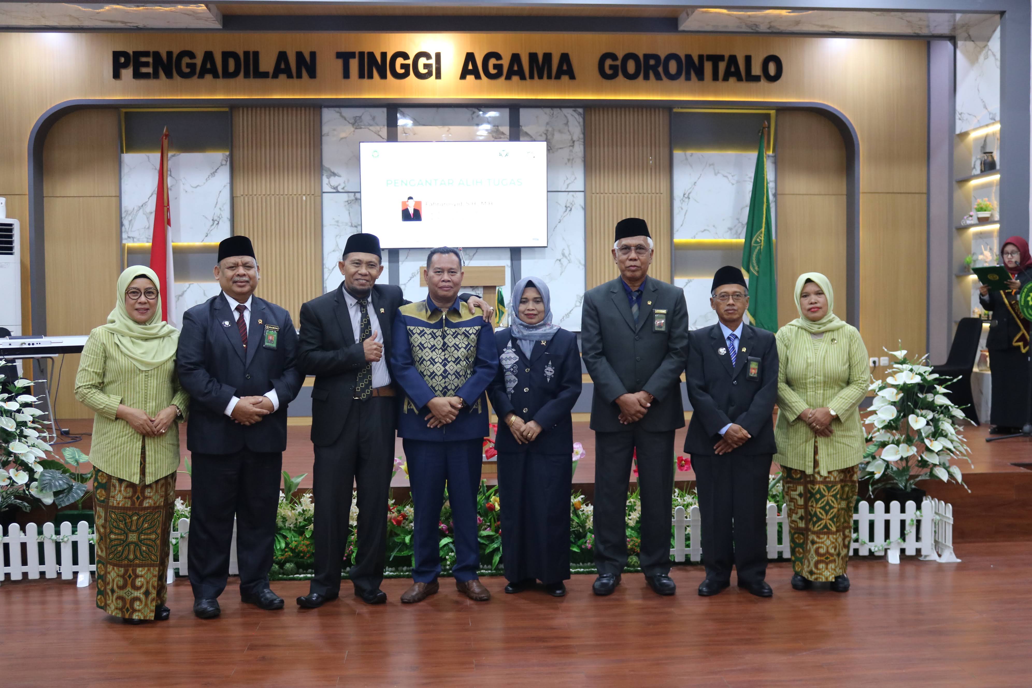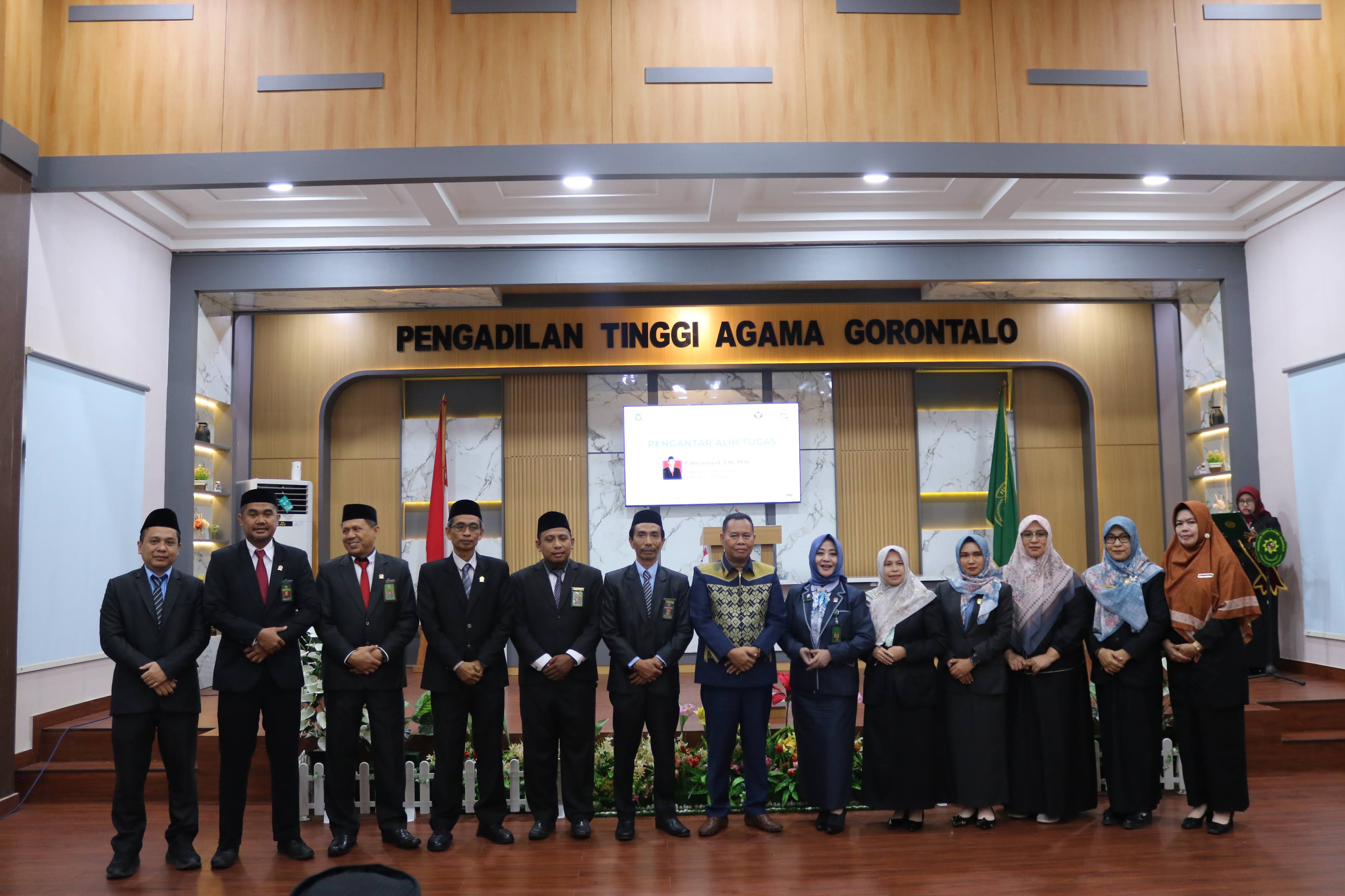 Gorontalo (16/4/2026) - Bertempat di Aula Kantor Pengadilan Tinggi Agama (PTA) Gorontalo, telah dilaksanakan upacara Pelantikan dan Pengambilan Sumpah Jabatan Sekretaris PTA Gorontalo yang dirangkaikan dengan Pengantar Alih Tugas. Kegiatan dihadiri oleh Ketua PTA Gorontalo, Ketua PTA Manado, Wakil Ketua PTA Gorontalo dan Wakil Ketua PTA Manado, para Hakim Tinggi, Panitera dan Sekretaris PTA Gorontalo, serta Ketua, Wakil Ketua, Panitera, dan Sekretaris Pengadilan Agama sewilayah PTA Gorontalo. Turut hadir pula pejabat struktural dan fungsional, pengurus dan anggota Dharmayukti Karini, serta seluruh pegawai PTA Gorontalo.