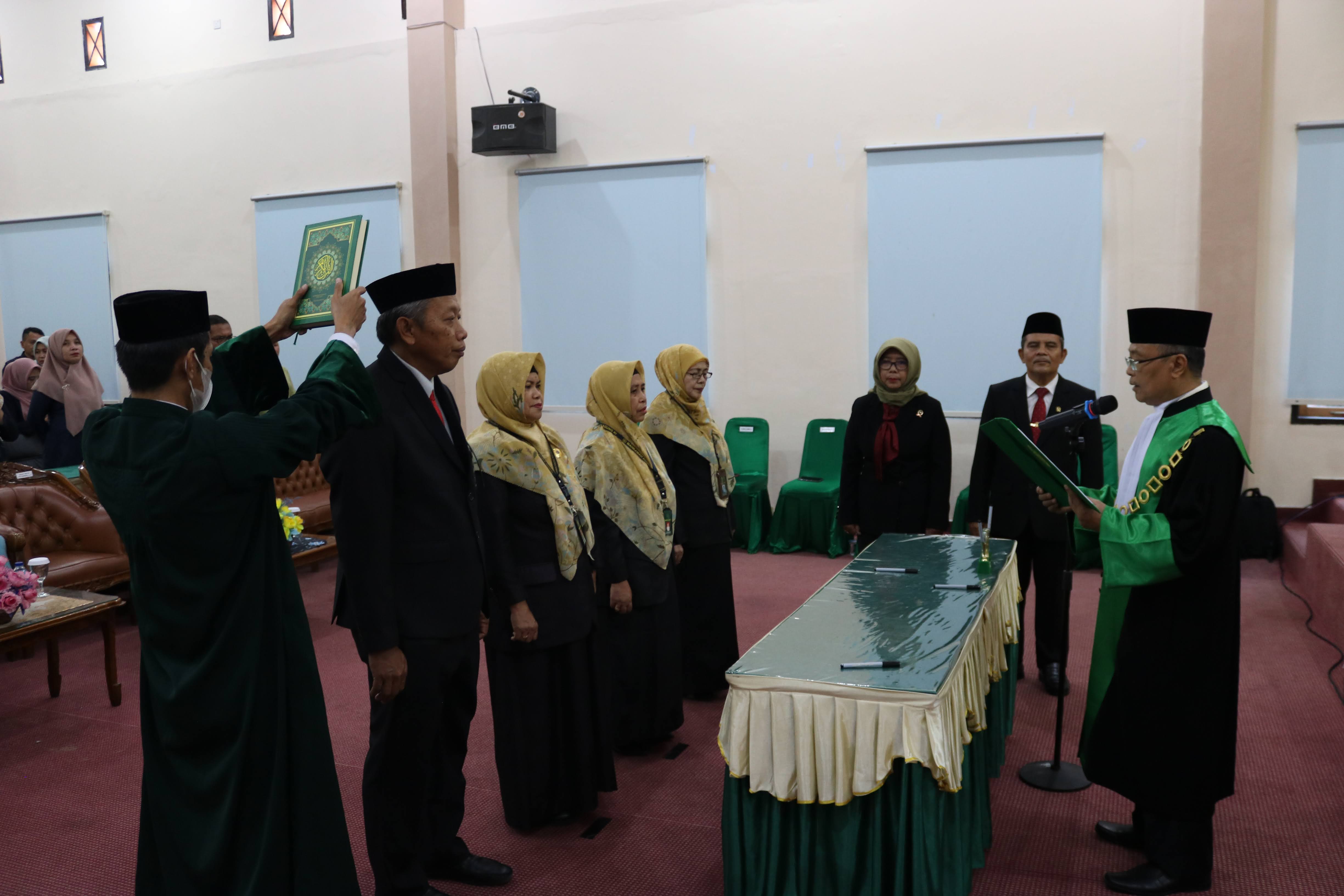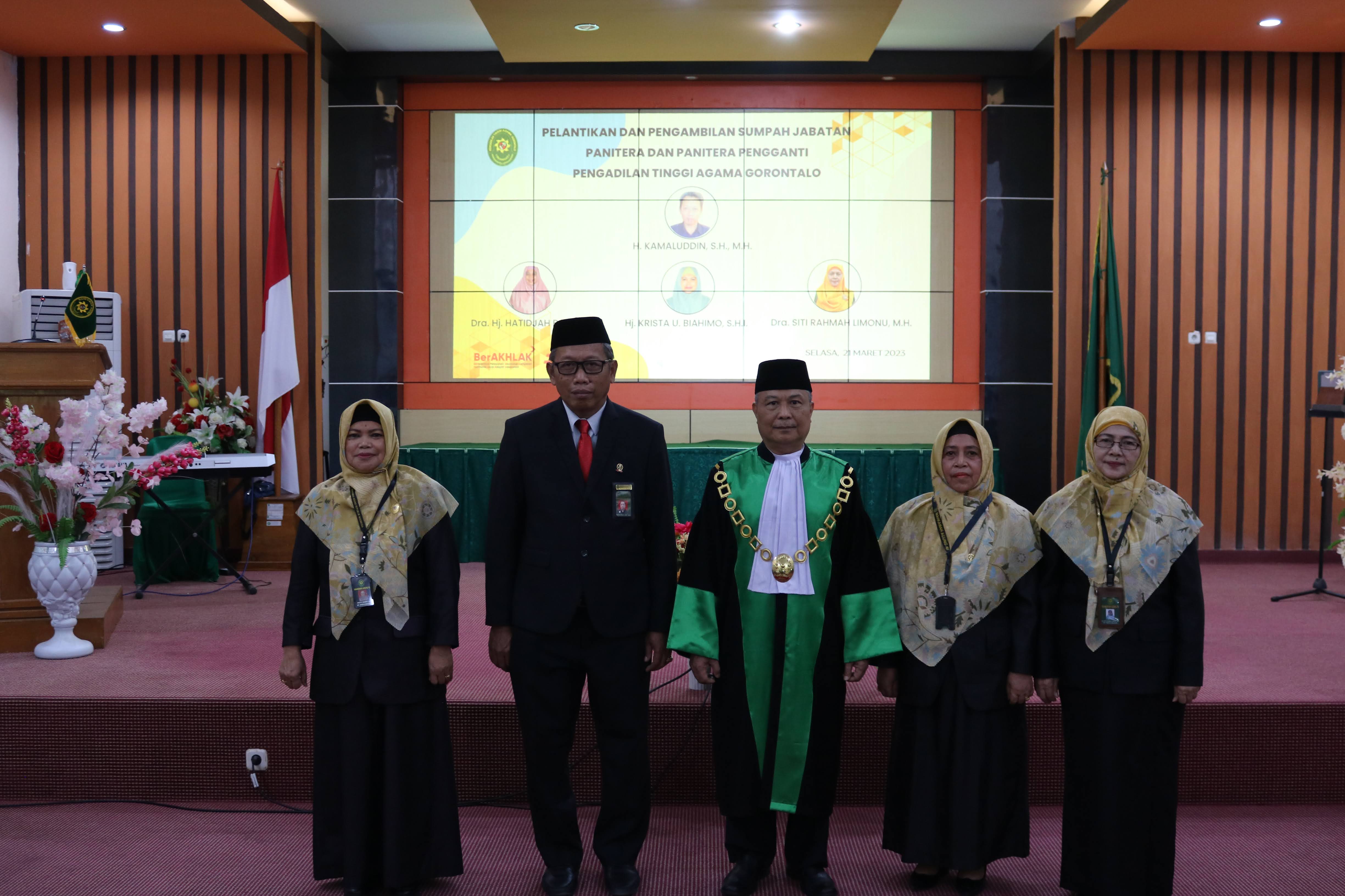 Ketua Pengadilan Tinggi Agama Gorontalo Drs. H. Abdullah, S.H., M.H. melantik dan mengambil sumpah jabatan H. Kamaluddin, S.H., M.H. sebagai Panitera, Dra. Hj. Hatidjah Pakaya, Dra. Siti Rahmah Limonu, M.H., dan Hj. Krista U. Biahimo, S.H.I. sebagai Panitera Pengganti PTA Gorontalo;
