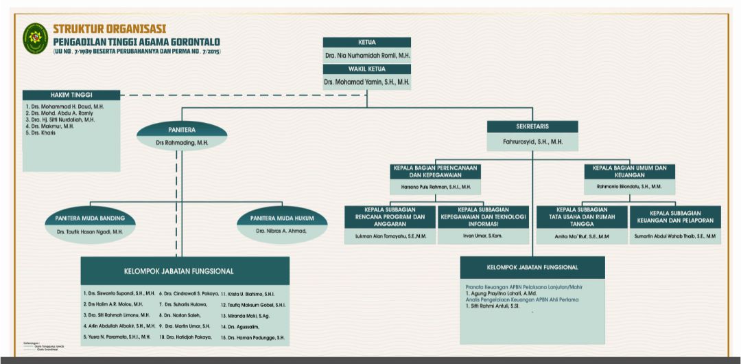 E-mail Cetak Struktur Organisasi Ditulis oleh Super User on 10 April 2017. Ditulis oleh Super User on 10 April 2017. Dilihat: 9030 STRUKTUR ORGANISASI PENGADILAN TINGGI AGAMA GORONTALO BERDASARKAN UU NO. 7/1989 BESERTA PERUBAHANNYA DAN PERMA NO. 7/2015 KETERANGAN : Klik kanan & buka gambar di tab baru pada gambar untuk memperjelas LIHAT PROFIL :1. Ketua2. Wakil Ketua2. Hakim Tinggi3. Kepaniteraan4. Kesekretariatan5. Tenaga Hororer